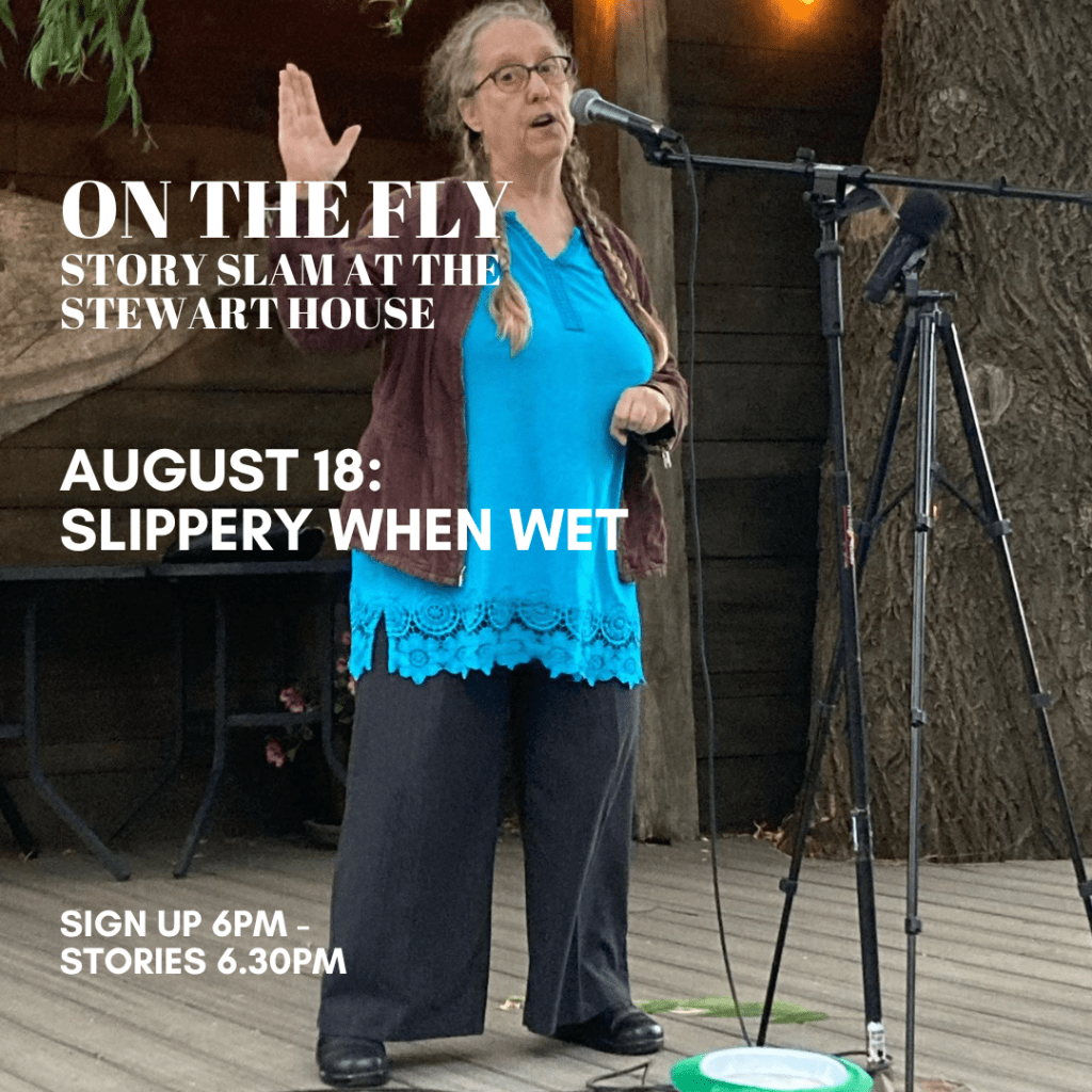 We hope to see you this Thursday at The Stewart House in Athens for another evening of stories by the river. Summer’s still here and the river garden at The Stewart House is one of the best places to enjoy it. Lots of yummy drinks and food. And why not throw your name in the hat to tell a story? The theme is SLIPPERY WHEN WET. What’s YOUR story? Sign-up 6pm, stories 6.30.