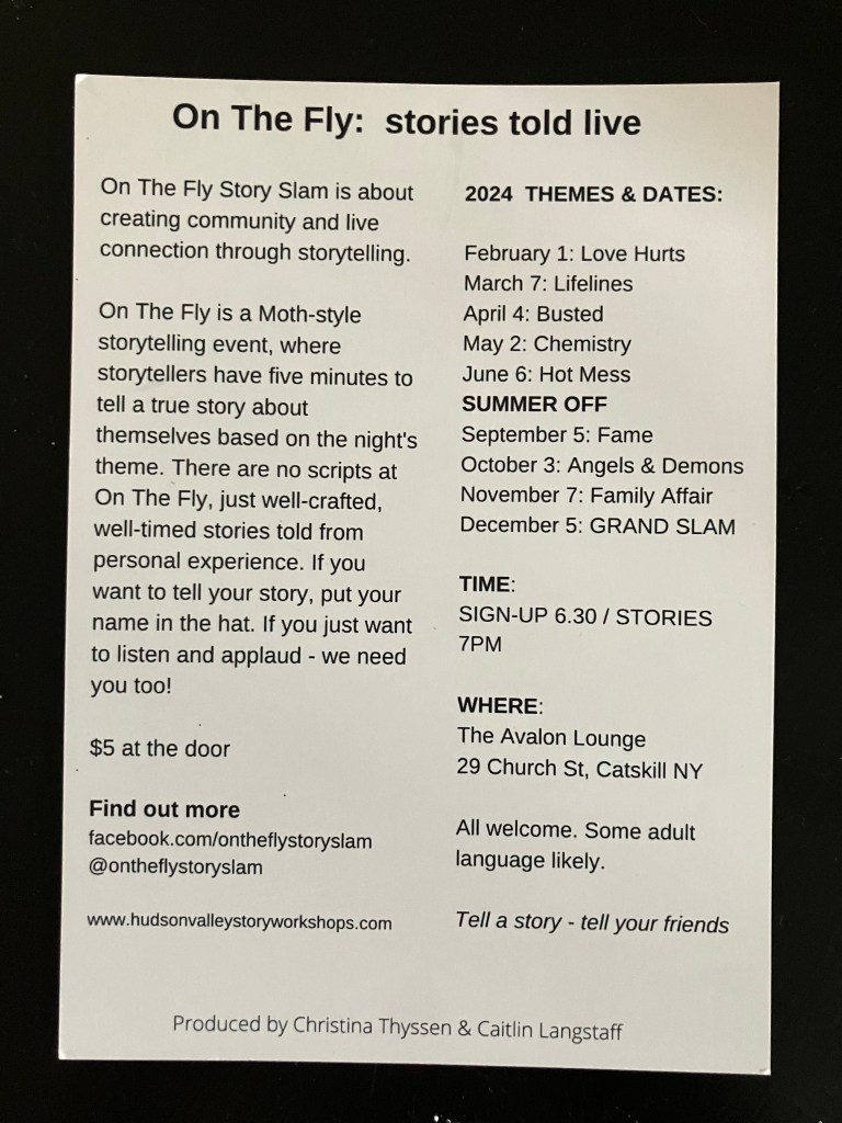 It’s almost time for the GRAND SLAM! Come hear stories told by the winners of this year’s story slams. You don’t want to miss this – and you might want to come early to order your food and grab a seat. Special musical guest appearances by On The Fly friends @cyote_lou and @adam.schartoff