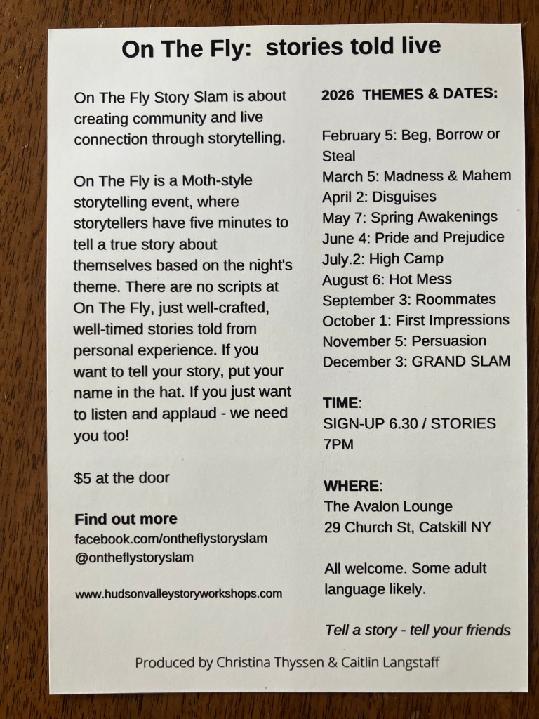 On The Fly is a monthly Moth-style story slam in the Hudson Valley. Slams take place on the first Thursday of every month at The Avalon Lounge in Catskill.